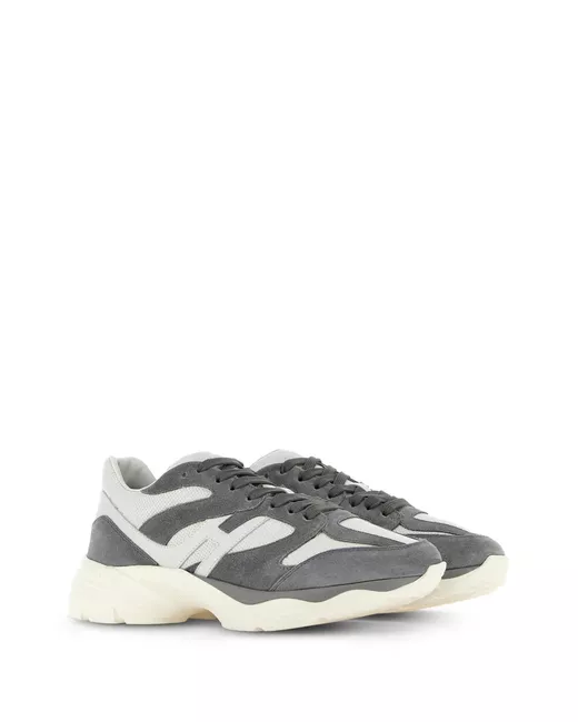 anthracite grey/light grey suede/calfskin panelled design logo-debossed tongue front lace-up fastening round toe branded footbed chunky rubber sole