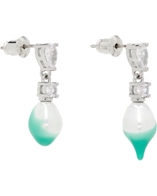 Pair of drop earrings in silver tone. Faux-pearl with green rubberized coating at drop. · Crystal-cut stones at face · Post-stud fastening · H1 x W0.25 Supplier color: Green