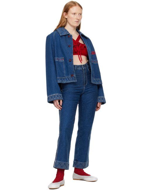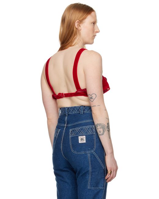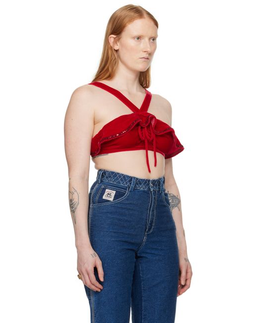 Upcycled rayon-blend velvet bra. Ruffled trim, embroidered, and sequinned detailing throughout. · Halter neck · Self-tie fastening and ruching at front · Pin-buckle fastening at back · Full velvet lining This item is part of a limited run of 12. Supplier color: Chili