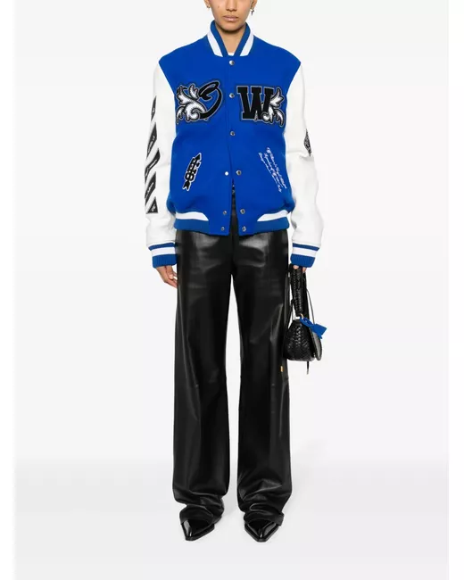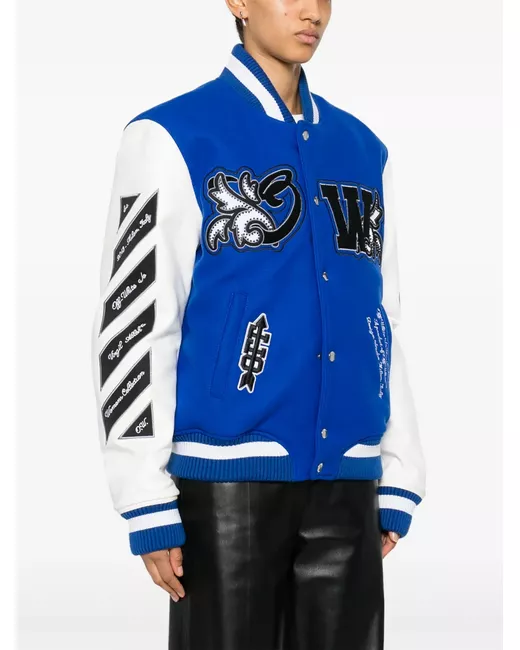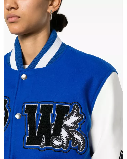 blue/white black virgin wool blend lambskin ribbed band collar drop shoulder long sleeves logo patch at the sleeve signature Diag-stripe appliqué logo patches to the front bead detailing two front welt pockets signature Arrows motif logo patch to the rear striped ribbed trim internal jetted pocket internal slip pocket logo-jacquard lining front press-stud fastening