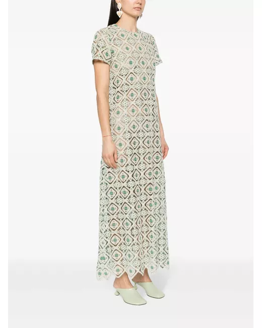 ecru/grass green macramé open knit semi-sheer construction round neck short sleeves ankle-length scallop hem unlined concealed rear hook and zip fastening