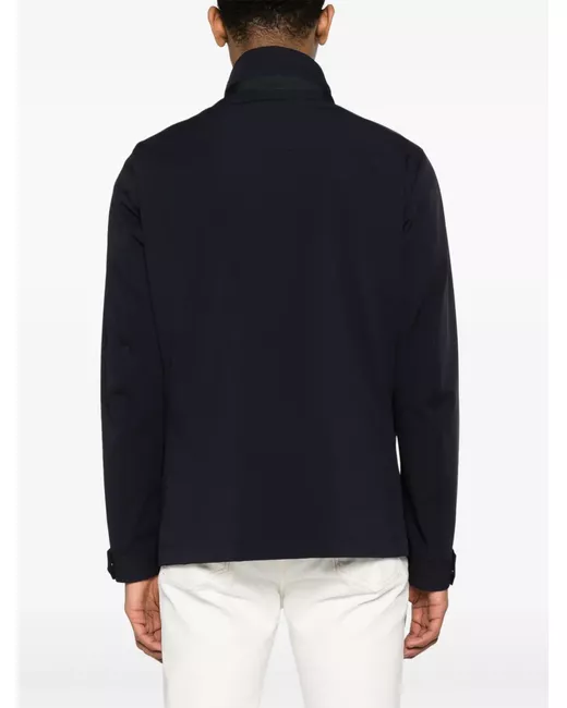 navy blue stretch-design technical jersey high neck Gancini buckle front press-stud and zip fastening long sleeves press-stud fastening cuffs two zip-fastening chest pockets four front flap pockets straight hem