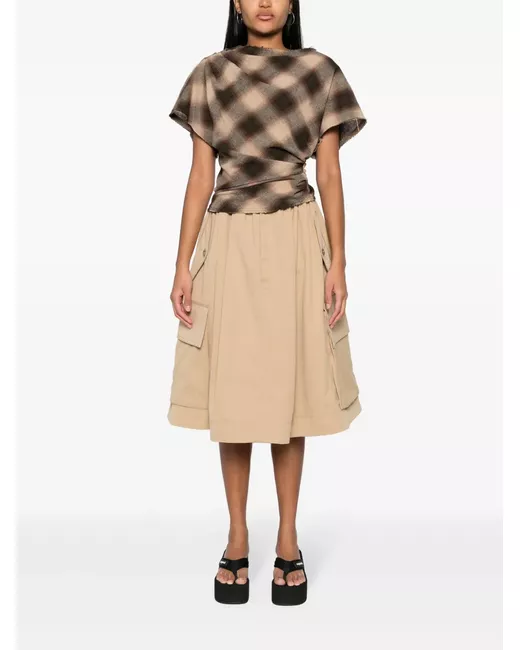 medium beige cotton belt loops four side flap pockets A-line mid-length unlined straight hem front button and zip fastening