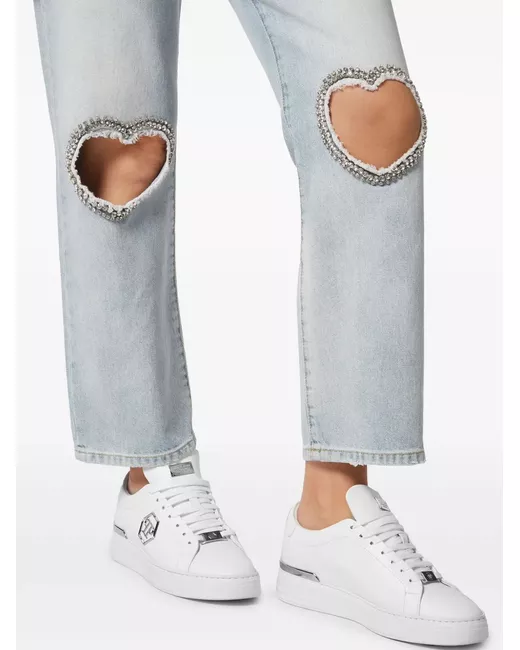 light blue cotton denim heart patch crystal embellishment high-waisted belt loops front button and zip fastening straight leg classic five pockets straight hem ankle-length
