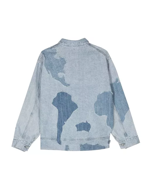 blue cotton twill weave washed denim denim patchwork design frayed detailing logo tag to the front logo-engraved buttons classic collar long sleeves buttoned cuffs two front patch pockets front button fastening straight hem unlined
