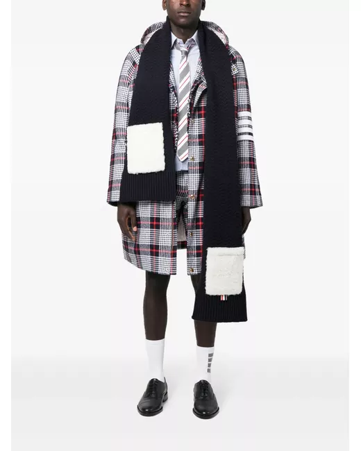 ribbed-knit scarf from THOM BROWNE featuring navy blue, wool, sheepskin, shearling trim, ribbed knit and logo-tape detailing.