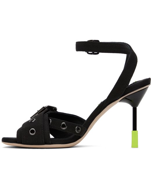 Canvas heeled sandals in black. · Eyelets throughout · Open square toe · Pin-buckle strap at vamp · Criss-crossing pin-buckle ankle strap · Logo patch at padded leather footbed · Buffed leather lining · Stiletto heel with rubber injection · Nubuck lining · Heel: H3.75 Supplier color: Black