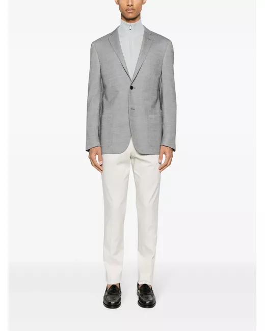grey virgin wool blend textured finish notched lapels front button fastening long sleeves buttoned cuffs chest welt pocket two front patch pockets English rear vents internal slip pocket straight hem partial lining
