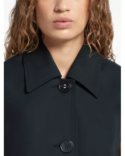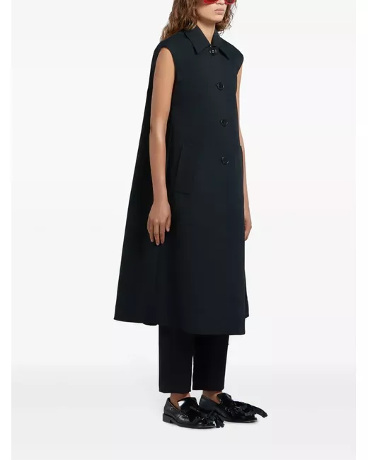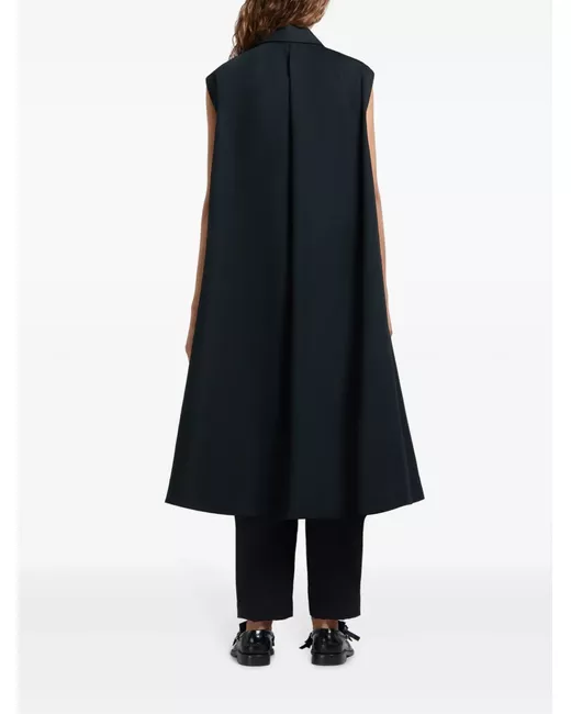 black cotton inverted pleat classic collar double-breasted button fastening sleeveless two front welt pockets mid-length