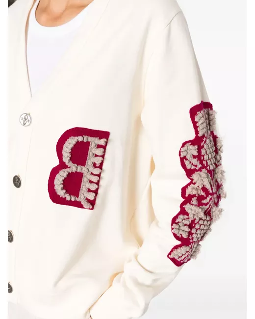 cream white cotton/cashmere embroidered logo logo-engraved buttons embroidered motif V-neck front button fastening long sleeves straight hem