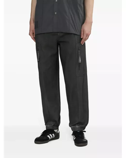black cotton appliqué detail elasticated waistband two front zip-fastening pockets two side slash pockets two rear flap pockets tapered leg elasticated hem