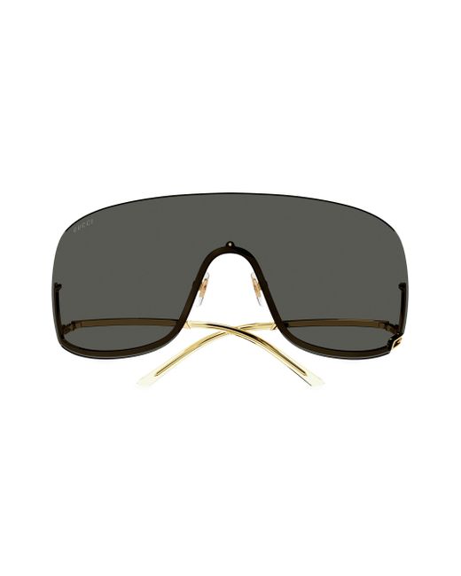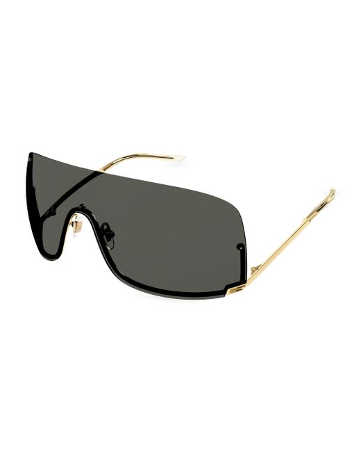 From the Tom Collection. These Gucci shield sunglasses are crafted from a blend of metal and nylon. The design features a drop temple for a unique touch. 100% UV protection Solid lenses Includes case and cleaning cloth Metal/nylon Made in Italy SIZE 99mm lens width 1mm bridge width 115mm temple length Please note: Lens replacement is non-optional. Soft Accessories - Sunglasses > Gucci > Saks Fifth Avenue > Barneys. Gucci. Color: Gold Grey.