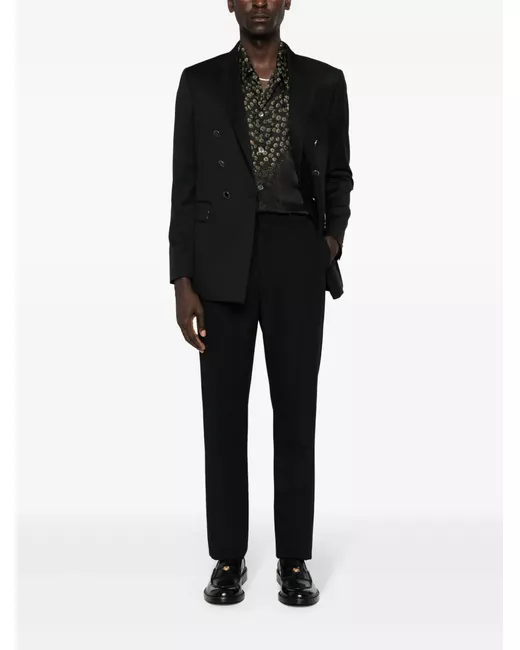 black virgin wool peak lapels chest welt pocket shoulder pads long sleeves buttoned cuffs two front flap pockets English rear vents internal jetted pockets leopard print lining double-breasted button fastening
