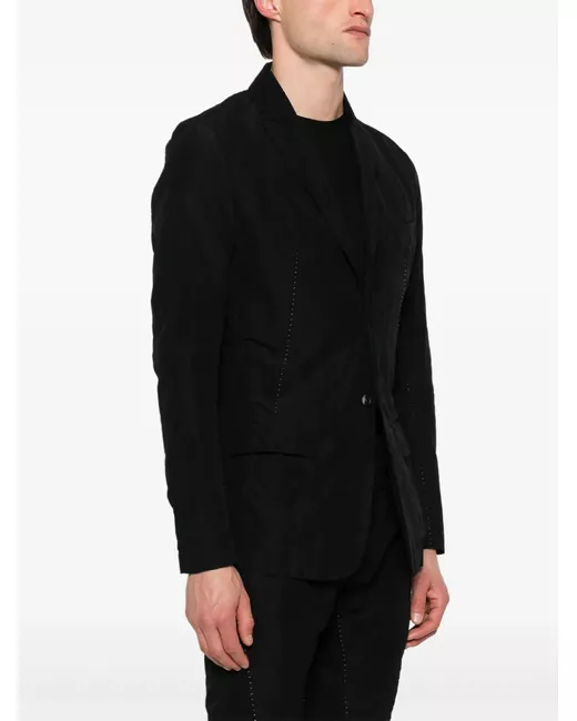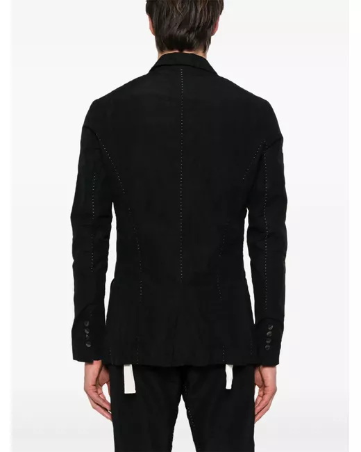 black cotton-linen blend panelled design textured finish contrast stitching notched lapels long sleeves with buttoned cuffs chest welt pocket dart detailing two side flap pockets central rear vent straight hem front button fastening