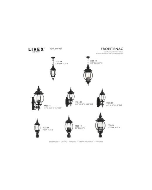The classically transitional outdoor Frontenac collection boasts a cast aluminum structure with dazzling ornamental design. The ornate quality of this light will add radiance to your house exterior day or night.