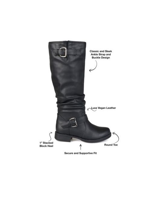 Add classic footwear to your style this season in women's riding boots by Journee Collection. These stylish boots feature premium faux leather ( polyurethane ) that rises below the knees. Straps with buckle embellishment and a classic round toes complete the design.