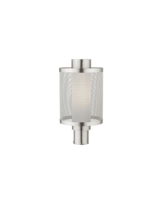 The Nottingham outdoor collection has a clean, crisp look and contemporary appeal. This single light stainless steel large post top lantern has a brushed nickel finish and features a sleek stainless steel mesh shade with satin opal white glass.