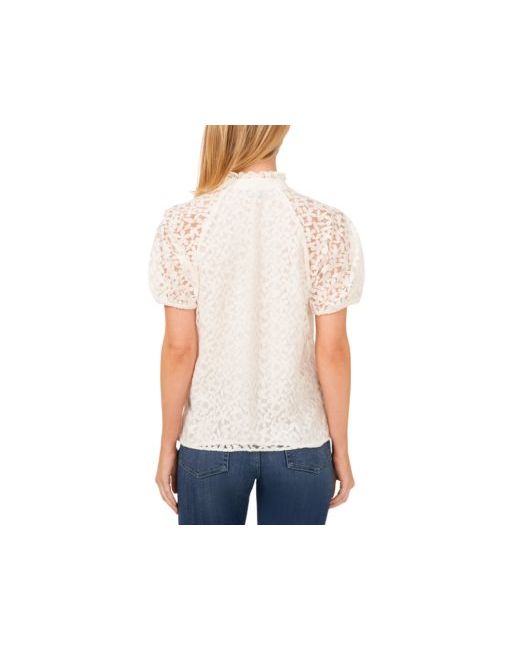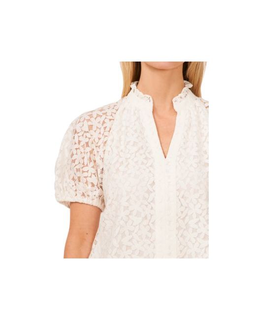 Sweet floral lace blooms all over CeCe's split neck top while short puff sleeves frame the sides for a playful finish.