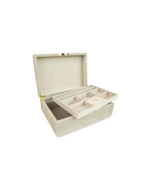 Mele & Co cream, leather jewelry box. Cream suede interior featuring a removable tray, revealing large storage section. Removable tray features seven storage areas and ring roll.