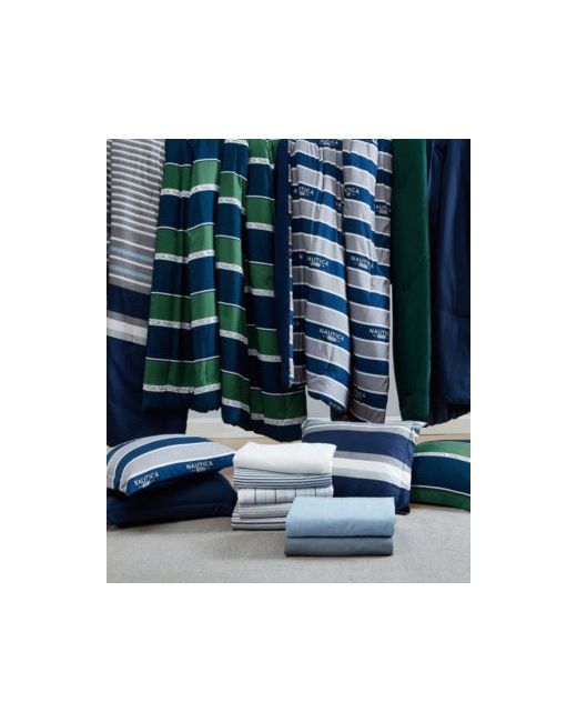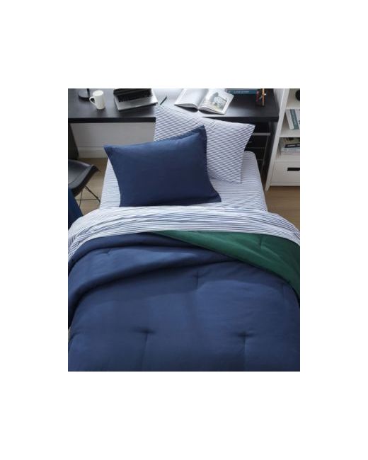 Get ready for back to school with Nautica's 6 piece bed set. Look no further for that perfectly coordinating comforter and sheet set. Each bed set includes a comforter, shams, fitted sheet, pillowcases plus packaging that doubles as a laundry bag the easy to transition into any dorm space bedding includes the reversible navy blue to pine green comforter and shams. The Nautica harmead fitted sheet and pillowcases features clean stripes with a textured navy blue print on a white ground. Each bed in a bag is constructed of polyester, with the microfiber brushed for added softness. All comforters have a 6 oz. Polyester fill that makes them ideal for all bedroom settings. Buying this one stop shop makes it convenient to not only make your room look cool for school but also is easy to care for as all components are machine washable.