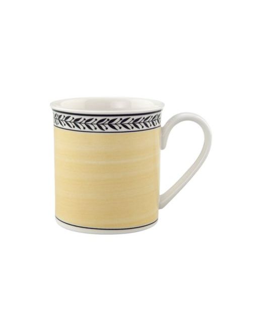Mix and match, choosing from four patterns of black-and-white French country scenes and designs on white porcelain banded in yellow.