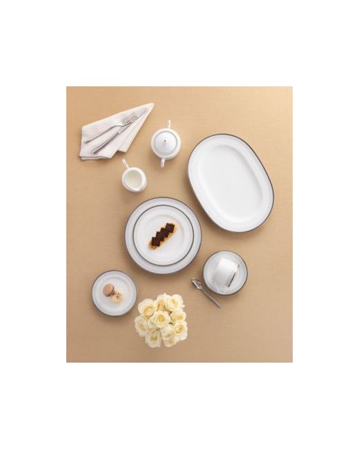 Silver Colonnade is a detailed design on white porcelain. The decal includes concentric squares with overlaying clovers, and an inner border of swoops and circles with long spires of platinum, all in light gray. Additionally, Silver Colonnade items are embellished with raised enamel dots.