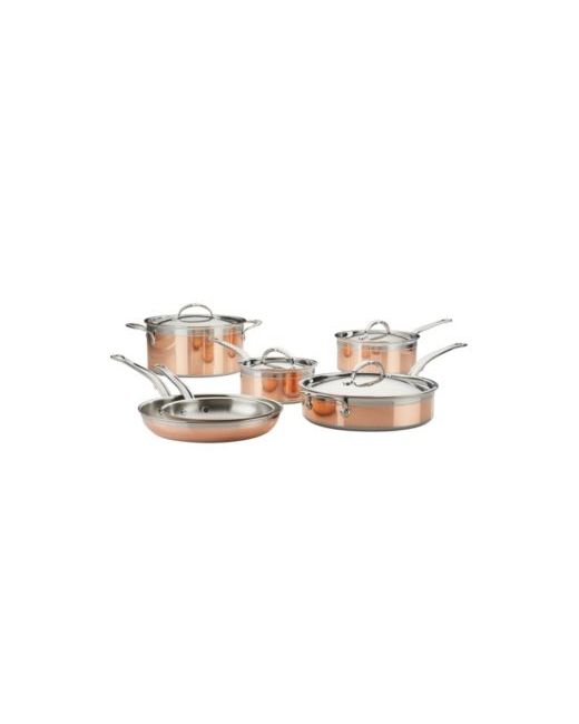 For ultimate performance and modern elegance, equip the kitchen with a Hestan CopperBond induction copper 10-piece set. This carefully curated cookware set features an assortment of pots and pans to accommodate a wide range of recipes and techniques. Pots and pans have been constructed from 5-layers of 18/10 stainless steel and a 100% copper core for quick, even heating and exceptional temperature control. This durable cookware set features flush rivets for easy cleaning and easy nesting storage. Stainless steel lids are interchangeable to fit the frying pans, while resting on the rims of all items to lock in vital heat for rich flavor. Ergonomic handles have been designed for maximum comfort and control, and are secured with flush rivets for easy cleaning and nesting storage capability. Handcrafted in Italy, this innovative, induction-compatible cookware set is oven safe to 600° F for superior cooking versatility.