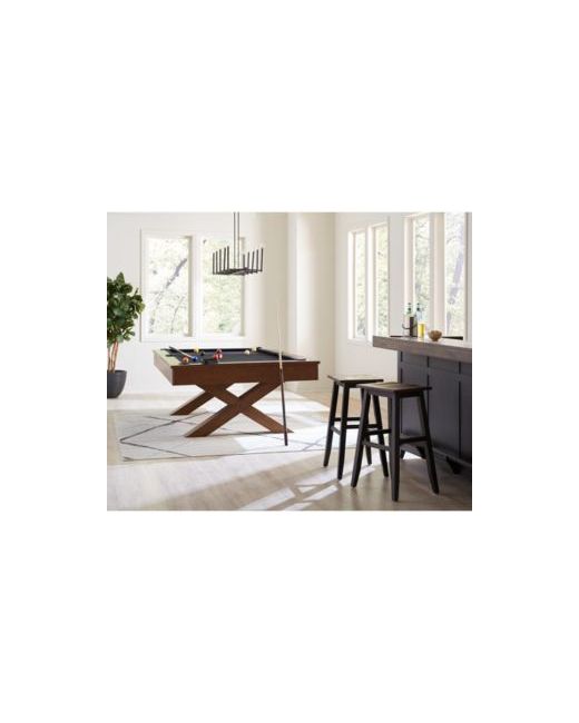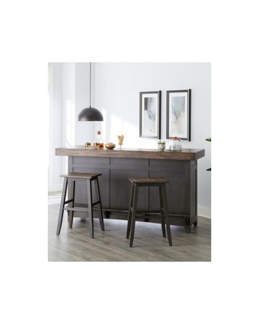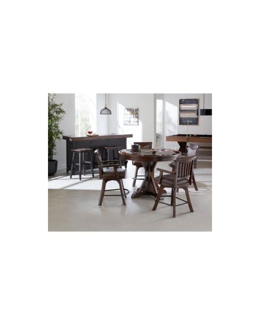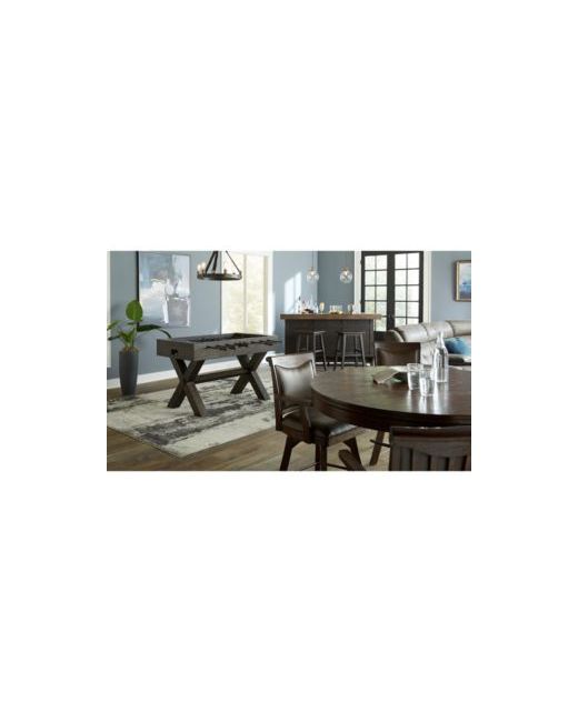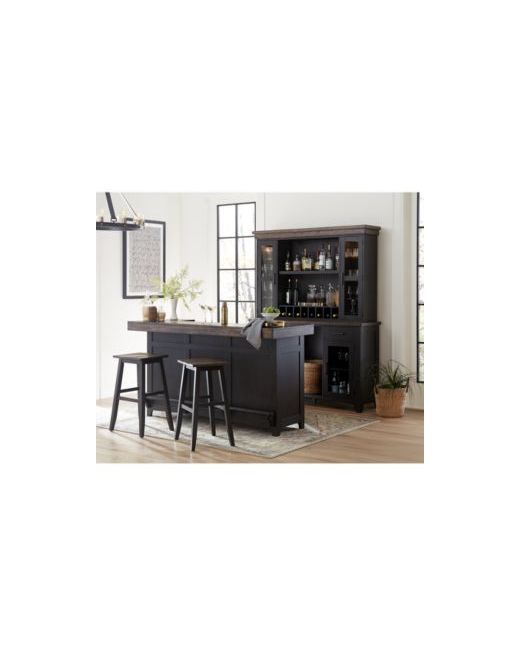 Peighton Collection bar group. The collection features a 78" bar paired with Mission style swivel barstools, and a back bar and hutch that can be fitted with a mini fridge or wine cooler or a 40" flat screen Tv. There is also a matching pub set with a 36" square top for bistro dining, family board games or card playing and two swivel stools.