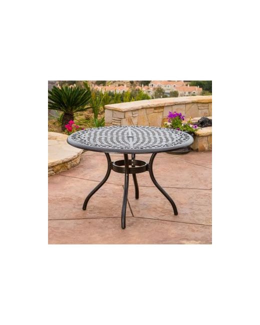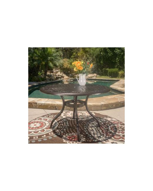 Create an alluring French-inspired bistro setting in your outdoor space with the floral embellished top and rich hammered bronze finish of this delightful round table.
