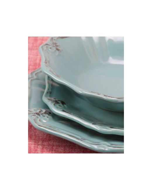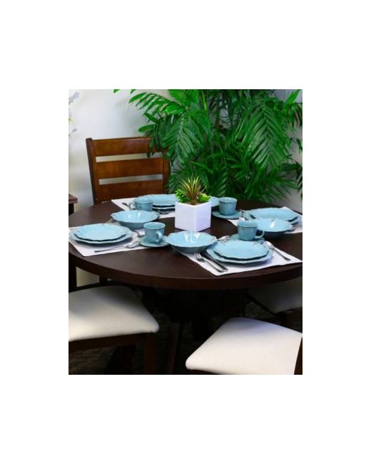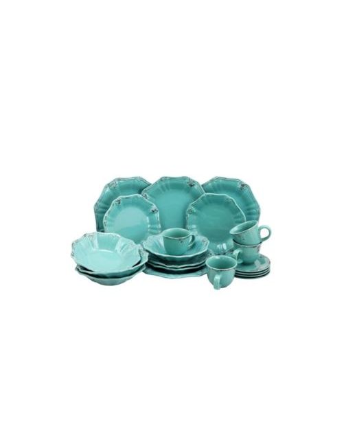 Set your family's table with the unique distressed pattern featured in this 20-piece Elama Fleur De Lys stoneware Dinnerware Set in Turquoise. A dark hand painted brown floral border on the rim provides a graceful contrast to the slender concentric circles on the plates' base. This service for 4 is dishwasher and microwave and oven safe to make your heating and cleanup quick and easy. This elegant set includes: Four Dinner Plates in at 10.5 inches, Four Dessert Plates in at 8.5 inches, Four Salad Bowl in at 8 inches and Four Mugs with saucers in at 8oz.