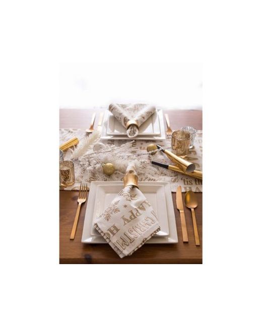 Our metallic printed Table runner with a whimsical holiday design to add flair to your table. Metallic gold-tone printed holiday icons on a white background is a chic and contemporary way to add Christmas cheer to your home.