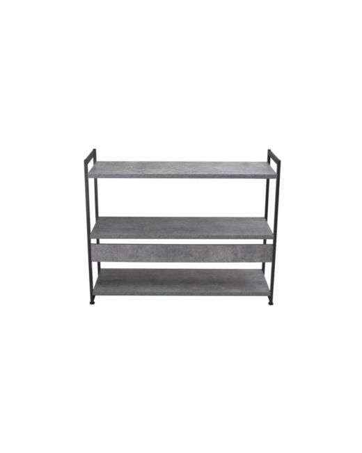 Household Essentials gray stone modular wide shelves are a set of long and low, free standing shelves with shelves. The wide shelves are braced, and supported by gray metal side frames.