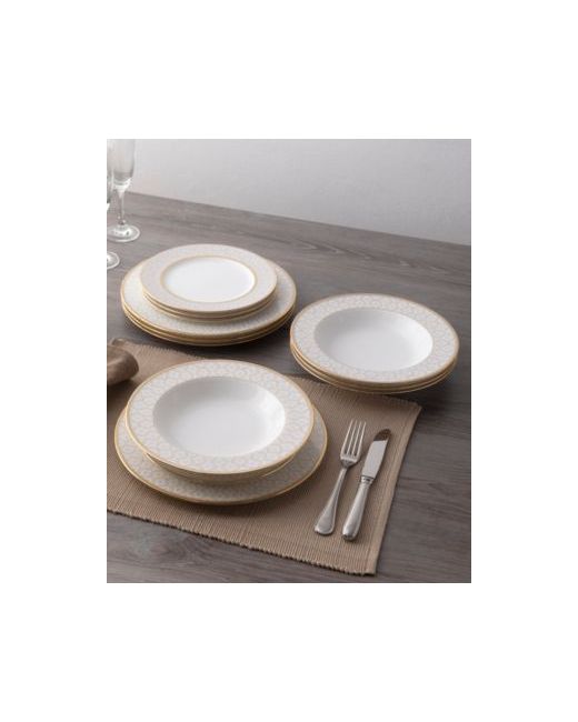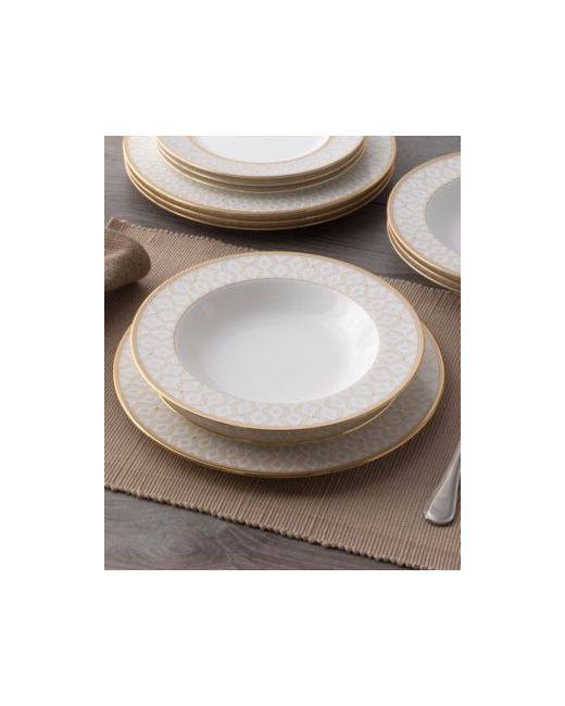 Noble Pearl is a modern and elegant presentation on bone china. The design juxtaposes the thin yet impactful lines of gold with the subtleness of light grey, offering a shadowy effect. Additionally, Noble Pearl items are embellished with raised enamel dots and 2 types of gold banding.