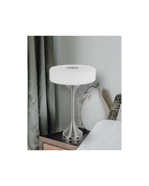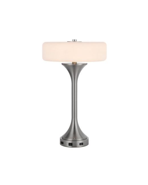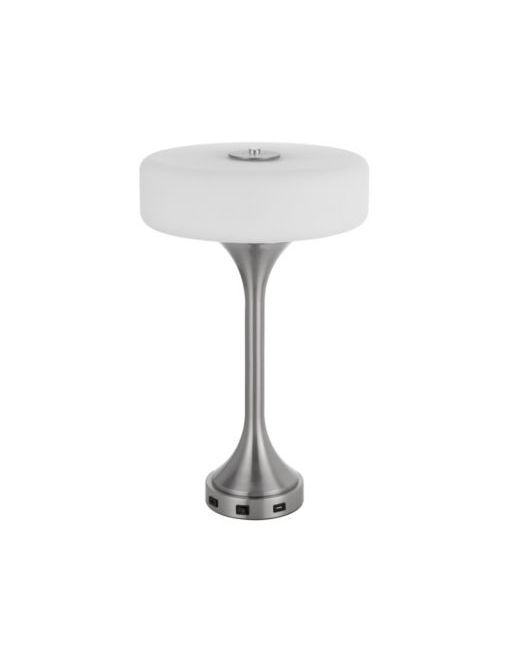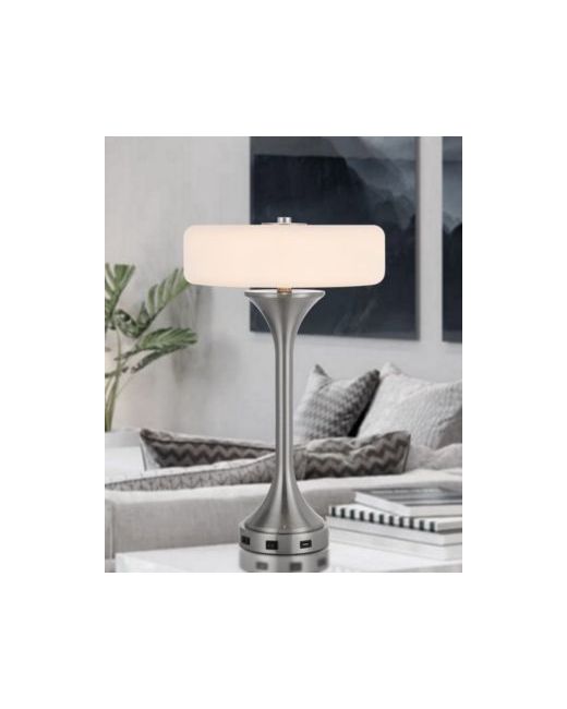This metal constructed modern table lamp is a great addition to any beside area, coffee table or home office. It features a reverse torch style body with and a wide bottom base for added stability. It has a rocker switch on base and two Usb ports for added functionality.
