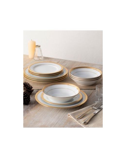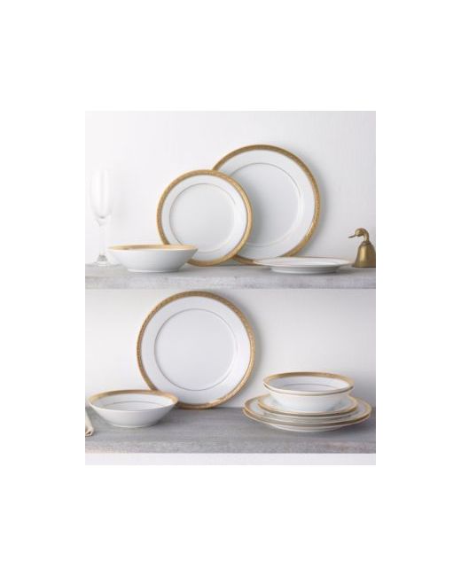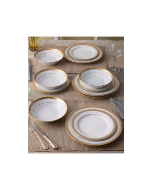 Crestwood gold-tone brings sophisticated elegance to the table. This stunning pattern features crisp bright white porcelain, paired with a gold-tone band for a look of elegant simplicity. The exterior gold-tone band is etched with a design of scrolling leaves.