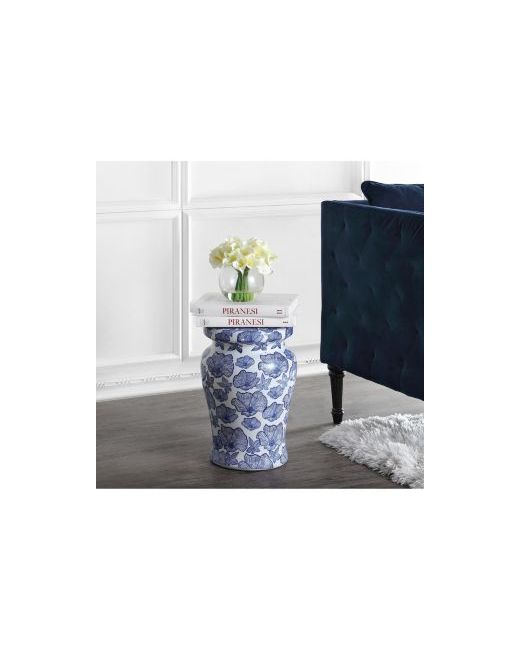 Our modern take on the blue and white ceramic garden stool is decorated with a graphic floral pattern. Stylized flowers in deep navy scatter across a clean white background. The classic silhouette is perfect for indoors or out as a side table, garden seat, or plant stand.