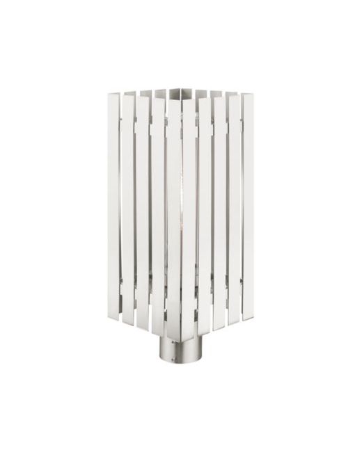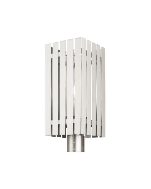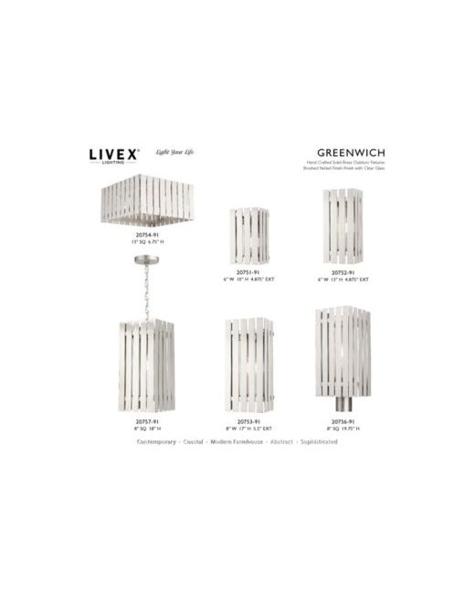 The Greenwich is defined by its bold geometric design and brushed nickel finish. The solid brass outdoor post top lantern features a clear glass cylinder under the striking cut-out design. Light shines from the top, as well as from the open areas of the design in the middle.