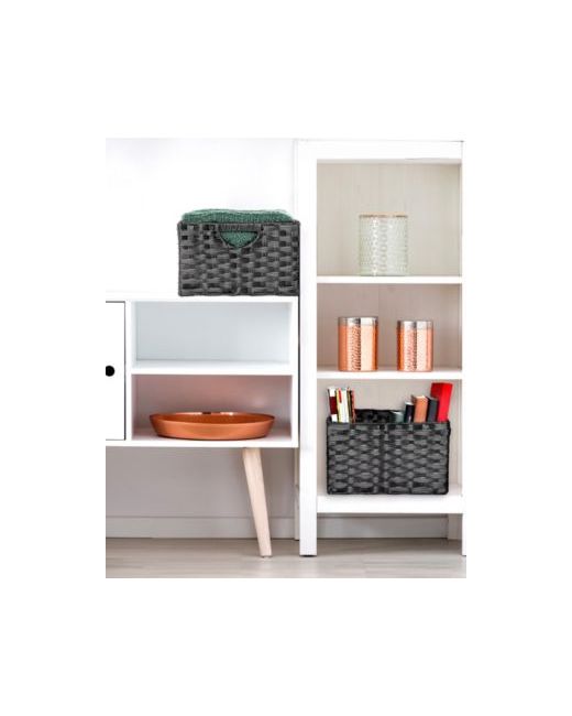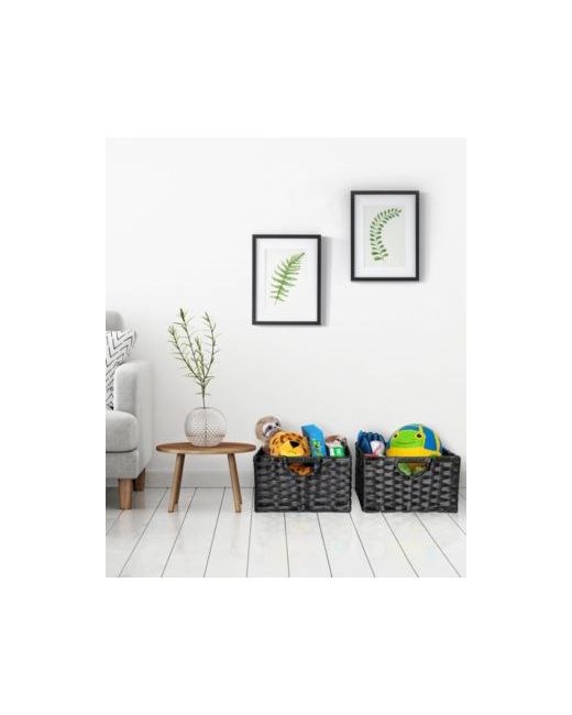 This 2 piece handwoven basket set is constructed from water resistant woven synthetic strands wrapped around a study steel frame with cut-out handles for easy carrying. each basket measures 13.25" W x 13.25" D x 8" H and is uniquely handwoven by local artisans.