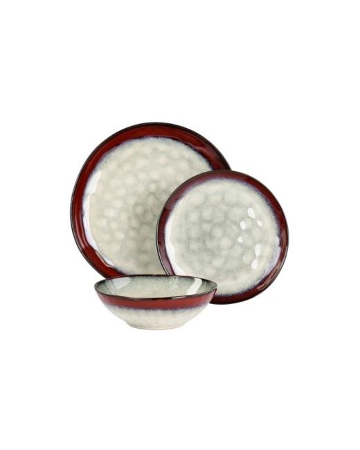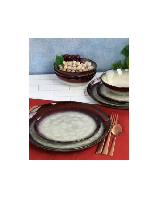 Elama Samara 12 piece stoneware dinnerware set in red and taupe is ideal for every day use. Textured design is also great to add a little style to your table setting when you are expecting guests. This charming set features an rounded shape and ombre style colored rim that highlights food beautifully, making your meals stand out. Constructed of sturdy stoneware, this set can be microwaved and used in the dishwasher time and time again for long lasting use.