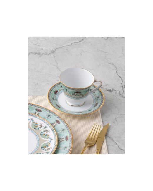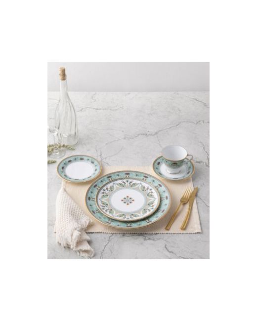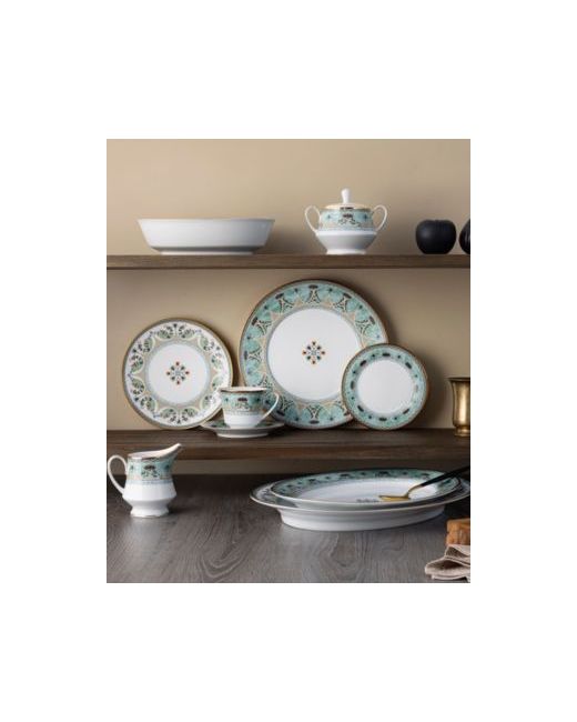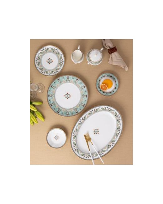 Serene Garden is a white porcelain pattern featuring an array of stylistic elements combined to create a harmonious design. The edges feature gold-tone banding and a chevron pattern. In addition, items feature arches paired with various presentations of lotus flowers, with a center medallion on selected items.