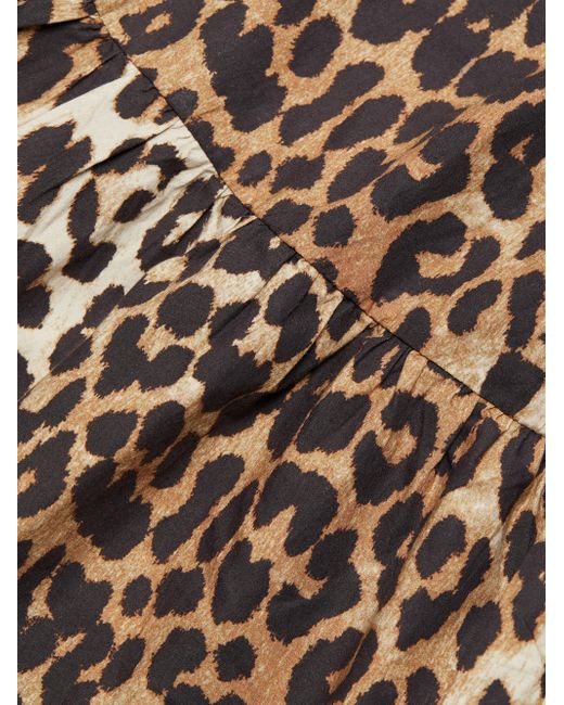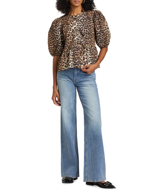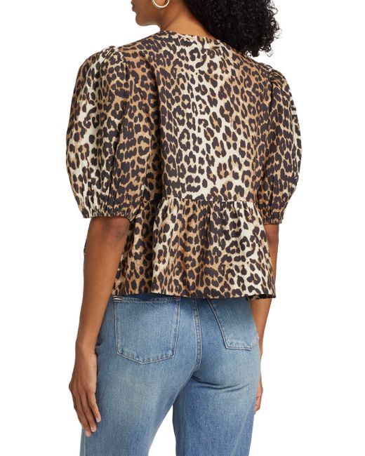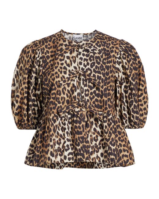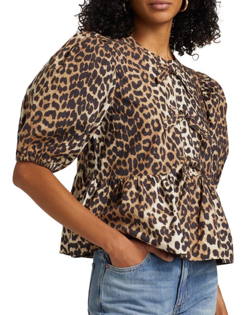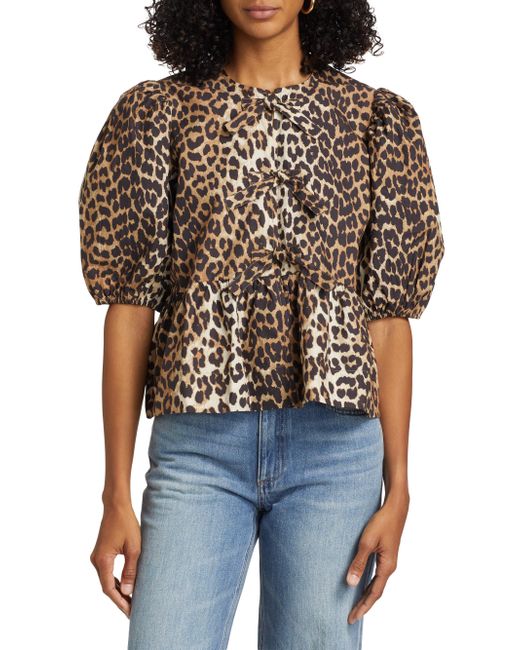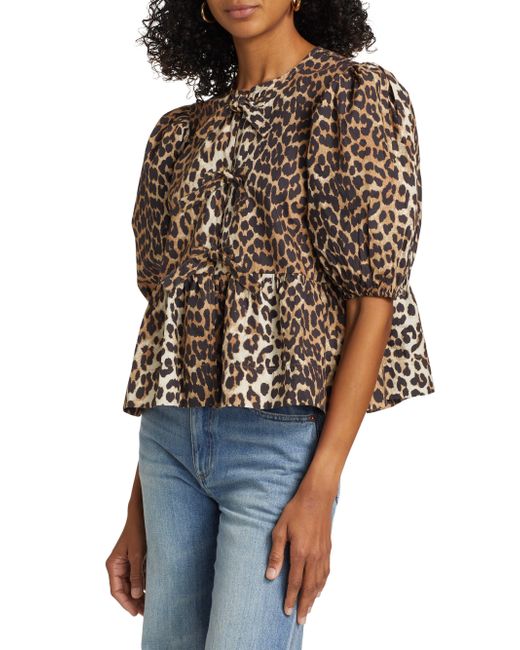 Crafted of poplin cotton, Ganni's charming blouse showcases a leopard print, puff sleeves, and a peplum hem. Crewneck Short puff sleeves, elasticized cuffs Tied front Peplum hem Pulls over 100% cotton Machine wash Imported SIZE & FIT About 21" from shoulder to hem Model measurements: 5'10" tall Model is wearing a US size 4. Contemporary Sportswear - Contemporary Collections > Ganni > Saks Fifth Avenue > Barneys. Ganni. Color: Leopard. Size: 2.
