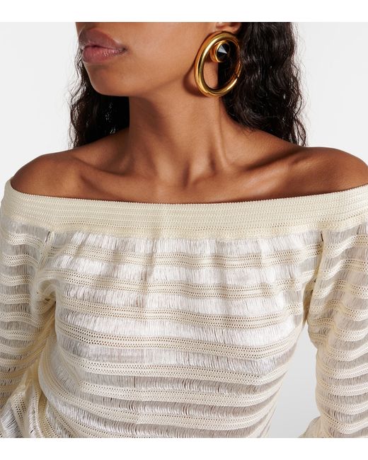 Off-the-shoulder Snake-effect Leather-trimmed Wool-twill Top