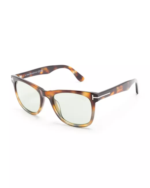 brown acetate tortoiseshell effect square frame green tinted lenses logo plaque at the tip straight arms with curved tips These glasses come with a protective case.