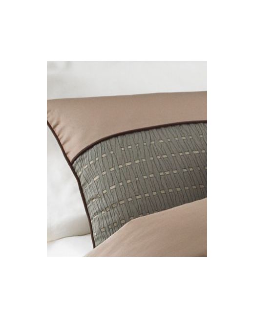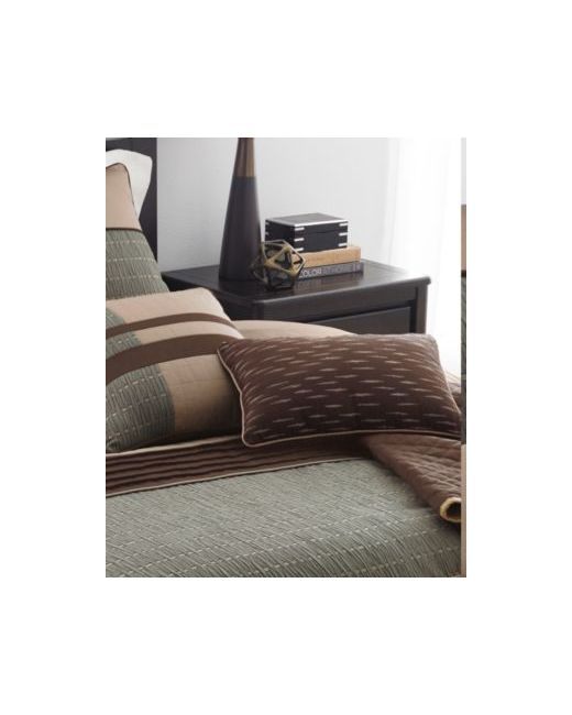 Add a masculine touch to the bedroom with the Lexia comforter set. The comforter and pillow shams are in colors of green, light brown and dark brown and feature patterns that include a solid portion, a quilted portion, a pleated portion, and a basket weave portion. The included 18 inch drop bed skirt is in a solid dark brown for added contrast and a tailored touch. The three square pillows included in the set complete ensemble.