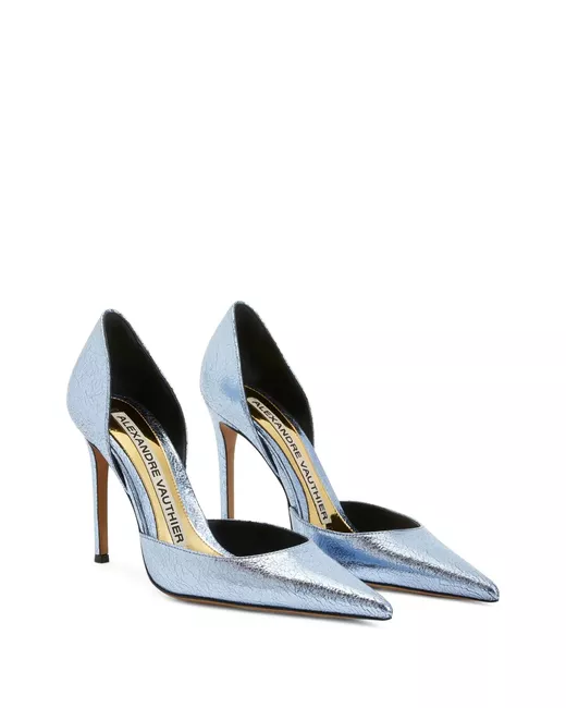 ice blue leather metallic finish cracked effect high stiletto heel branded footbed pointed toe