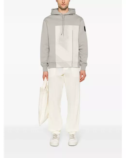 cool grey cotton jersey texture graphic print to the front logo patch at the sleeve embroidered logo to the rear drawstring hood long sleeves ribbed cuffs and hem front pouch pocket straight hem French terry lining