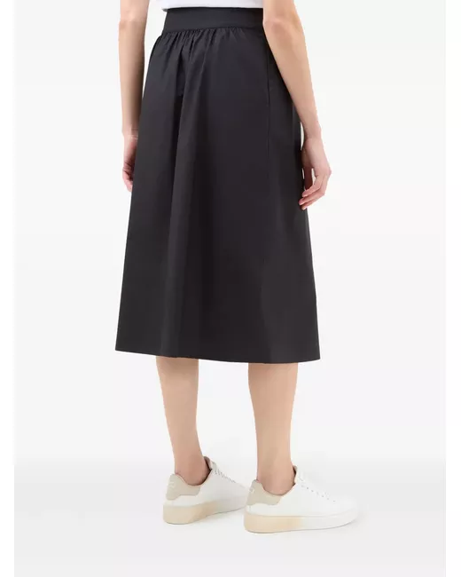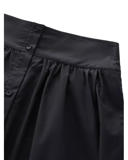 black cotton poplin texture pleat detailing high-waisted front button fastening two side inset pockets A-line straight hem mid-length