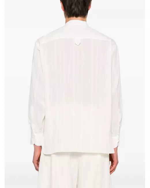 white cotton interlock weave semi-sheer construction vertical stripe pattern band collar concealed front button placket long sleeves with buttoned cuffs hem gusset short side slits curved hem