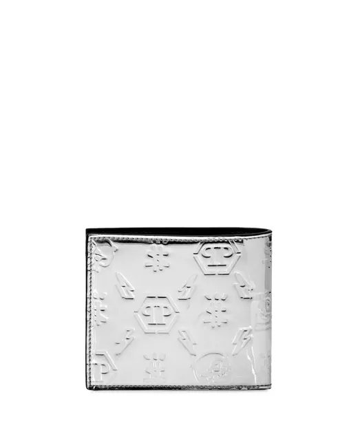 silver-tone calf leather metallic sheen embossed monogram pattern bi-fold design note compartment internal card slots