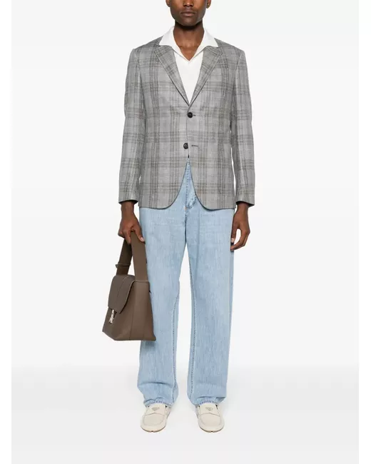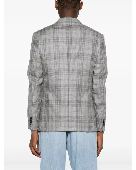 grey/brown wool blend check pattern notched lapels front button fastening long sleeves buttoned cuffs chest welt pocket two side patch pockets partial lining multiple internal pockets English rear vents straight hem